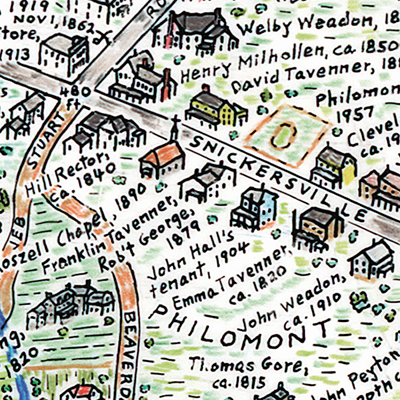 The map shows hundreds of structures, landmarks, towns, roads, and points of interest that still exist, or did exist, with dates of construction and other interesting facts. It is a "must have" keepsake for anyone who enjoys the rural character of Snickersville Turnpike. It is suitable for framing and makes a great conversation piece in any home or office. The price of the map is $25 and is available for sale to the public at Bluemont General Store and Philomont Store. It is also for sale through the STA booth at yearly events such as the Bluemont Fair and Aldie Harvest Festival. At right you can see an example of the intricate detail of this map. It's a fascinating way to portray the 'pike! Our "Driving Historic Snickersville Turnpike" Brochure