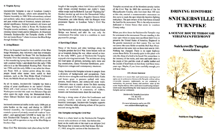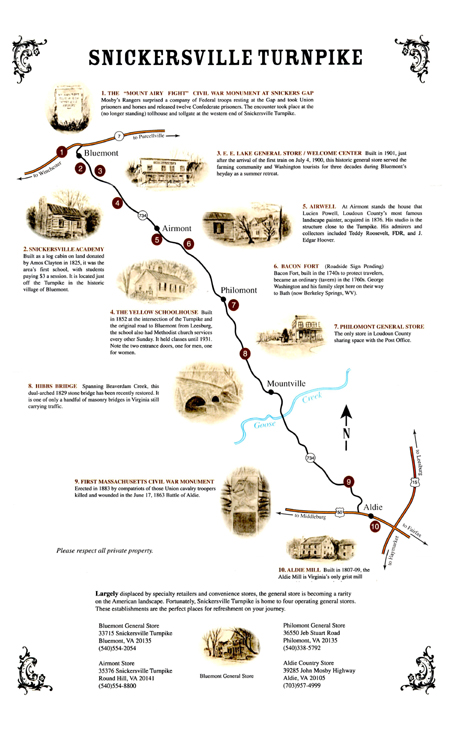 At many business locations along the 'pike, like the general stores in Bluemont and Airmont, you can pick up our "Driving Historic Snickersville Turnpike" brochure. Or, you can download it and print one for yourself, or just reference it with your cell phone.