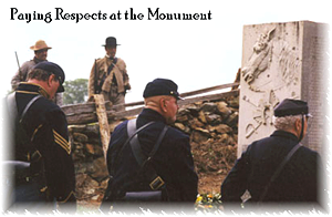 In 1995, the Snickersville Turnpike Association applied for Federal funds to restore two sites along the Turnpike - one in the area around a former one-lane bridge and the other at the Civil War Monument erected in 1883 by survivors to commemorate their comrades in the 1st Massachusetts Regiment who were killed, wounded or captured on June 17, 1863 at the First Battle of Aldie. Under the Federal program, STA had to contribute $14,000, which was 20% of the grant requested. After six years of bureaucratic delays, STA is pleased to announce that the work in both areas has been completed and that we are delighted with the results. In celebration of this major accomplishment, there was a ribbon-cutting ceremony at the monument site on August 18th, 2001. The site had been saved and restored. Members of the 1st Massachusetts Cavalry reenactment unit drove down from Massachusetts with their horses where they were joined by cavalry re-enactors from Virginia. Seven of the Loudoun County Board of Supervisors attended, as did Delegates Joe May and Bob Marshall. Both Union and Confederate troopers laid a wreath at the monument and then the citizens retired to a picnic supper at George and Marcia de Garmo's where there was good food, good music and good friendship. It was a celebration that affirmed that citizens that care could save places that are threatened. There is now a grassy pulloff area capable of supporting a tour bus, and signage describing both Confederate and Union positions. The stone fence, behind which sharpshooters from the 2nd and 3rd Virginia Cavalry had dismounted and inflicted such heavy casualties on the 1st Massachusetts Cavalry, has been restored to its 1860's condition. STA was able to acquire 100-year old chestnut rails, and they now constitute the rail fence paralleling the Turnpike. Dead trees have been removed, and a few native trees planted. The view across the Turnpike has been cleared, and much of the battlefield can now be readily seen. You really must see it to appreciate the entire restoration. |